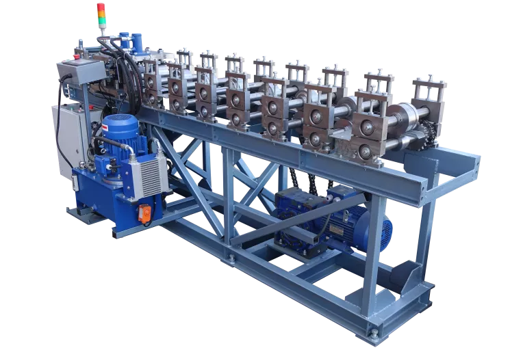 Станок оснащен штампом-гильотиной для вырубки пазов и пробивки отверстий и штамп-гильотиной для вырубки паза и отрезки до профилирования. На выходе из станка получается готовый профиль с предварительно вырубленными углами и пробитыми отверстями. Размеры профиля, кол-во профилей задаются на панели оператора системы автоматического управления. Готовые профиля по длине получаются с точностью +- 1 мм.
